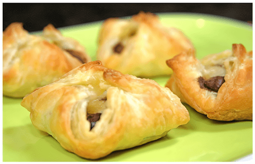 Чтобы конвертики закрыть, четыре угла каждого квадрата надо приподнять по очереди и закрепить над начинкой. Диагональные щели хорошо пригладить подушечками пальцев, чтобы при выпечки начинка не могла выпасть наружу.