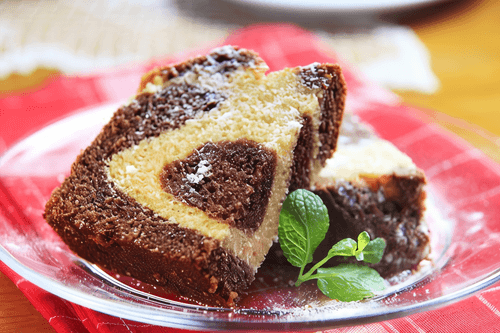 Вылейте тесто с какао в смазанную маслом форму для выпечки и слегка перемешайте с белым тестом, чтобы получить эффект мрамора.