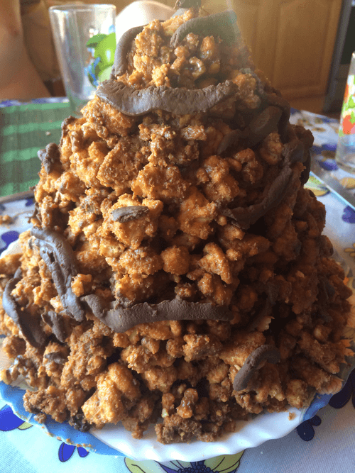 Полученную смесь выложить горкой на блюдо и посыпать тертым шоколадом.