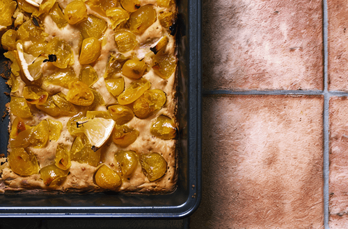 Кумкват измельчить следующим образом - каждый плод поделить на четыре части. Выложить поверх теста ровным слоем.