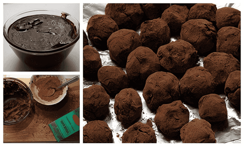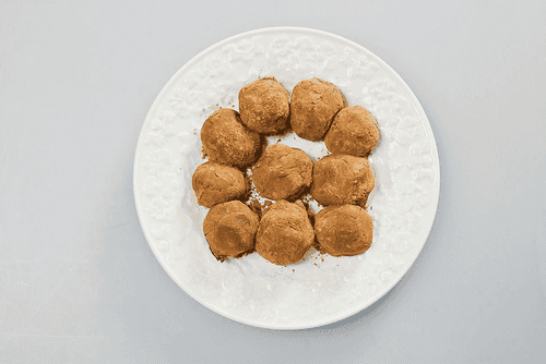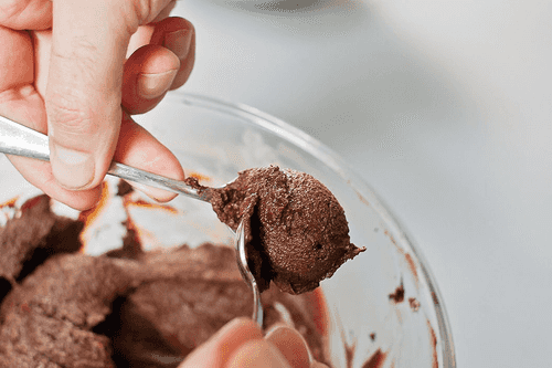 При помощи двух чайных ложек или просто руками скатать из шоколадной массы шарики размером с грецкий орех. Чтобы масса не липла к ложкам и пальцам, их можно периодически смачивать в теплой воде.