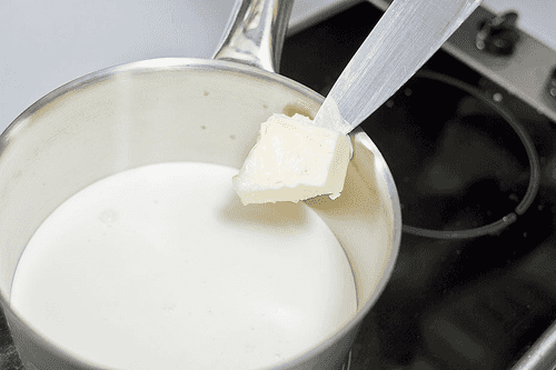 В небольшой ковшик налить сливки и поставить на средний огонь. Когда сливки подогреются, добавить сливочное масло, помешать ложкой и довести смесь до легкого кипения. Снять с огня.