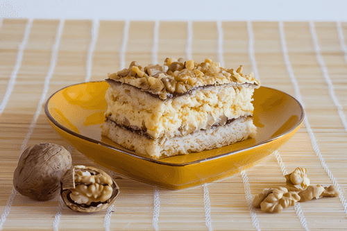 Торт с грецкими орехами — изысканное лакомство русской кухни, сочетающее нежные текстуры и насыщенный ореховый вкус. Исторически орехи символизировали достаток и мудрость, а их добавление в десерты придавало выпечке насыщенность. В этом рецепте воздушный бисквитный корж пропитывается ароматным кремом, а крошка из теста с орехами создает аппетитную текстуру. Крем, приготовленный на основе молока и сливочного масла, добавляет нежность, а ванилин тонко подчеркивает сладость. Торт идеален для праздничного чаепития или уютных вечеров, когда хочется насладиться традиционными вкусами. Охлажденный десерт становится еще более насыщенным, позволяя ингредиентам раскрыть свои богатые оттенки. Он прекрасно сочетается с крепким чаем или ароматным кофе, дополняя их мягкими сливочными нотами.