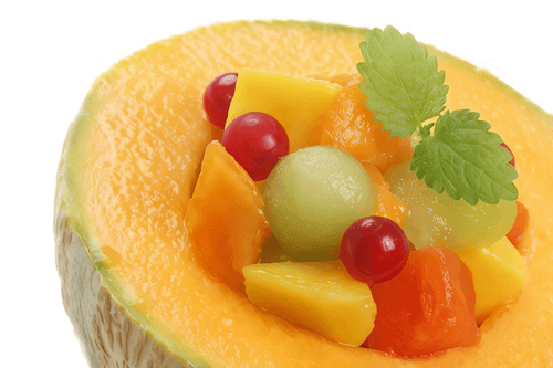 Дыню разрежьте пополам, удалите семена и осторожно, чтобы не повредить кожуру, отделите и выньте мякоть. Нарежьте ее небольшими кубиками.