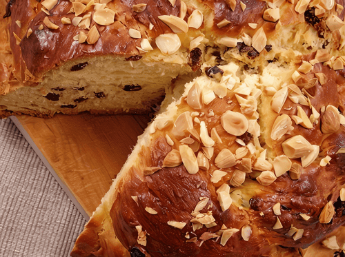 Размягченное сливочное масло растереть с сахаром, солью, мускатным орехом, желтками и яйцами. Смешать с опарой и вымесить тесто. Поставить в теплое место на 30 минут.