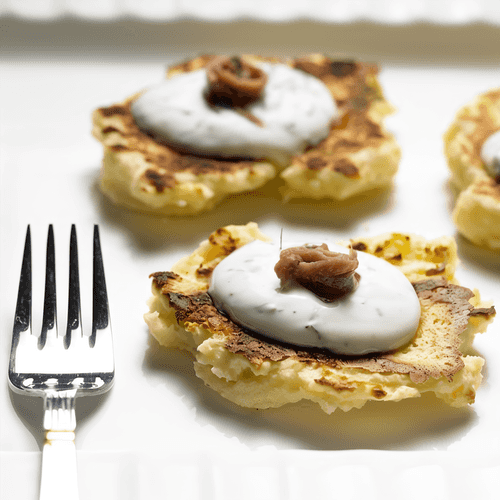 В сковороде разогрейте небольшое количество оливкового масла. Выкладывайте по 1 столовой ложке теста на небольшом расстоянии и жарьте 3-4 минуты с каждой стороны до готовности. Сохраняйте теплыми, положив в разогретую духовку. Подавайте со сметаной.