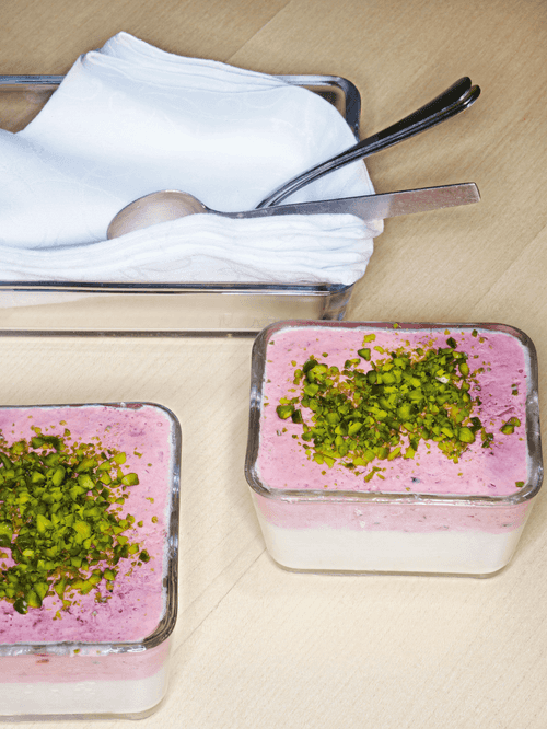 Творог смешать с медом. На дно каждой из шести формочек положить слой творога и залить смесью сливок и черники. Поставить в холодильник и держать до тех пор, пока смесь не загустеет. При подаче посыпать рублеными фисташками.