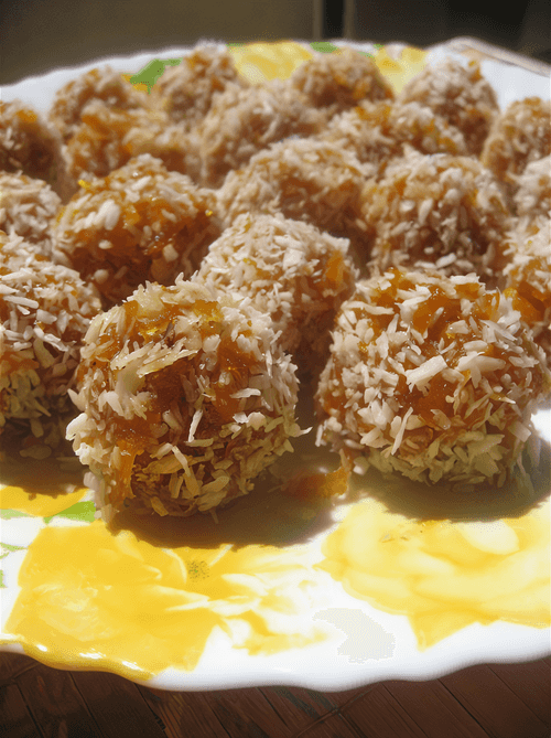 Затем сразу же обвалять их в кокосовой стружке и выложить на блюдо на блюдо.