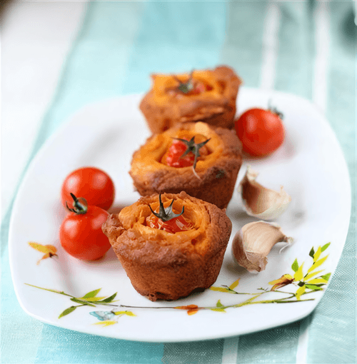 Нарезанные мелкими кусочками сосиски, сыр, томатную пасту, выкладываем в формочки для кексов. Сверху в каждый кекс кладем помидор-черри.