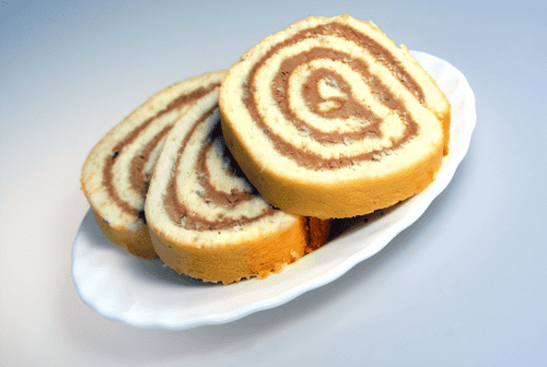 Намажьте корж шоколадной пастой и сверните в плотный рулет. Охладите примерно 1 час и порежьте на куски.