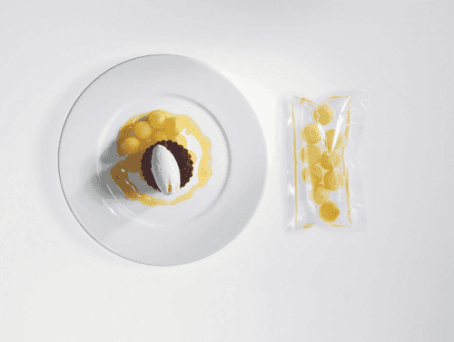 Очистить яблоки, специальной ложкой вырезать из их мякоти шарики и сложить их в пакет. Смешать 150 мл вина и пол-литра питьевой воды, растворить в этой смеси полкило сахара и залить ей яблоки. Завакуумировать пакет.