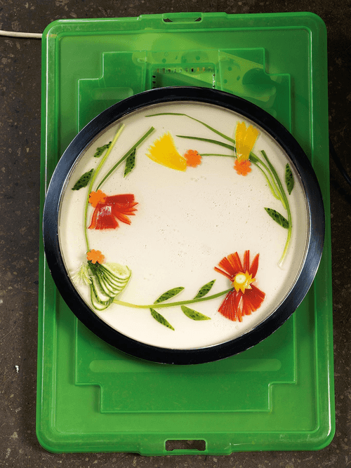 Молочное желе – это не просто десерт, а настоящее произведение кулинарного искусства. В поварской школе Le Cordon Bleu создание узоров из свежих овощей и фруктов на поверхности этого желе является важным этапом обучения. Эти красочные композиции не предназначены для того, чтобы их пробовать, а скорее служат для того, чтобы восхищаться ими. В нашем панно мы использовали яркие оттенки красного и желтого болгарского перца, освежающий огурец, нежный зеленый лук, сладкую морковь и кислинку лимона, создавая гармоничное сочетание цветов и текстур. Такой десерт идеально подходит для подачи на праздничных мероприятиях, где его эстетика будет не менее важна, чем вкус.