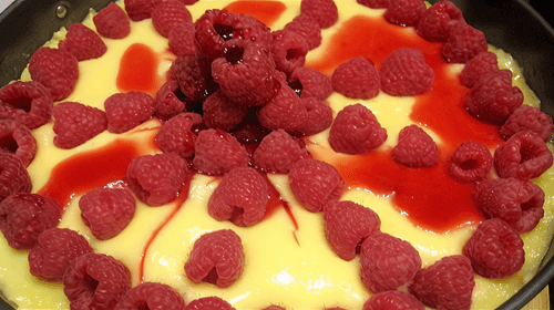 Дать остыть до комнатной температуры, затем отправить на час в холодильник. После чего достаем и украсить малиной и сиропом.