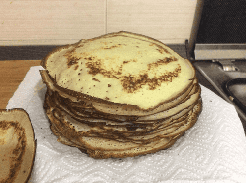 Каждый блинчик жарить с первой стороны до румяного золотистого цвета. Перевернуть на другую сторону и еще чуть-чуть обжарить. Готовый блинчик смазать сливочным маслом.