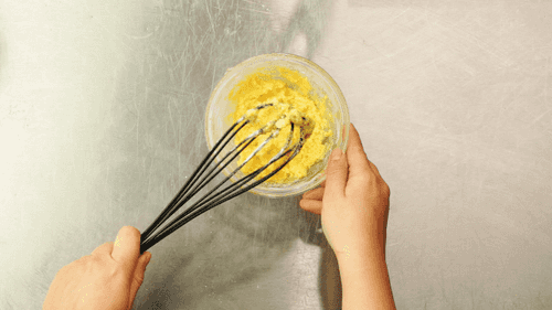 Отделить желтки от белков. Желтки, 50 грамм сахара, крахмал и муку перемешать венчиком до однородного состояния.