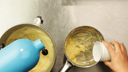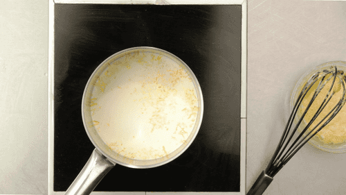 В молоко добавить цедру, вскипятить в сотейнике, перелить в яичную смесь. Перемешать и перелить обратно в сотейник, где готовилось молоко. Подержать на огне полторы минуты, непрерывно работая венчиком: должно получиться нечто вроде заварного крема, по консистенции масса должна быть похожа на сгущеное молоко.