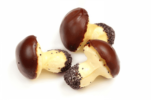 Ножки грибов обмакнуть по очереди в оставшиеся взбитые белки а затем сразу — в мак. Каждую шляпку обмакнуть в смеси белков и шоколада. Оставить на час подсохнуть. Печенье готово.