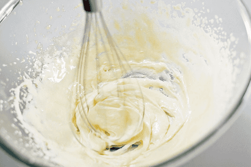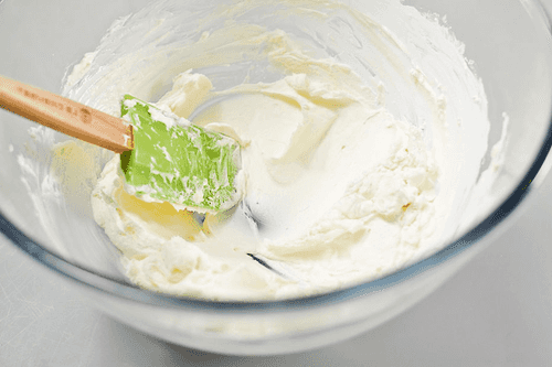 Выложить маскарпоне в широкую миску и интенсивно взбить лопаткой или венчиком до однородного состояния — консистенция сыра должна стать почти такой же нежной, как у жирных сливок или густой сметаны.