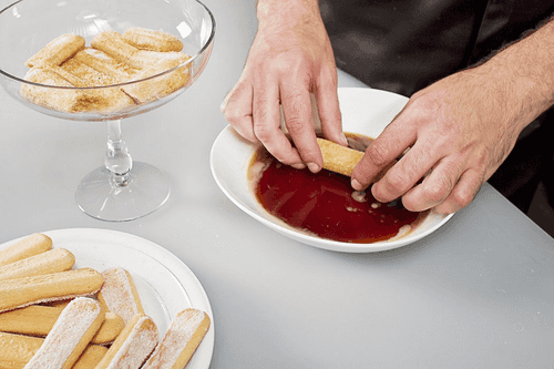 Аккуратно обмакнуть в смесь кофе и рома треть или половину савоярди — в зависимости от ширины формы, в которой вы хотите подавать десерт. Если форма не слишком широкая, тирамису можно сделать трехслойным, взяв по десять штук савоярди на слой.