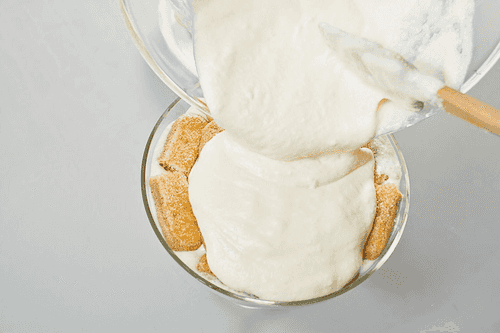 Отделить белки от желтков. В одной миске взбить желтки и сахарную пудру добела и получившуюся массу постепенно добавить к маскарпоне, взбивая все вместе венчиком. Отдельно взбить белки и затем — по одной ложке — аккуратно вмешать в смесь желтков и маскарпоне.