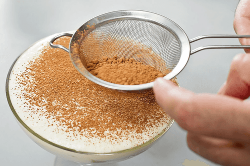 Перед подачей готовый десерт посыпать какао — для этих целей лучше использовать мелкое сито, чтобы на поверхности не было комочков и слой получился равномерным.