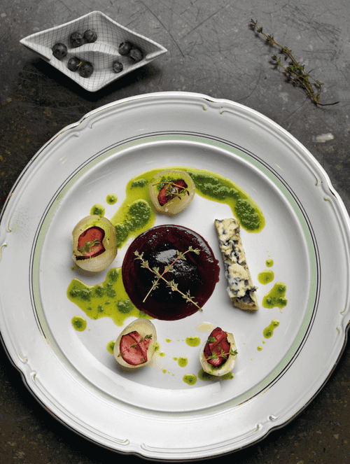 Голубой сыр с луком и черничным соусом – это изысканное блюдо французской кухни, в котором тонкий баланс кисло-сладких и пикантных нот создает неповторимое вкусовое удовольствие. Исторически голубой сыр, например, рокфор, считается символом гастрономического совершенства Франции, а его сочетание с фруктовыми соусами – признанный кулинарный прием. В этом рецепте благородная горечь бальзамического уксуса и медовая сладость усиливают природную терпкость черники, создавая глубокий, насыщенный соус. Маринованный шалот и нежные лепестки белого лука придают текстурную сложность, а зелёное масло из петрушки завершает композицию свежими травяными нотами. Это блюдо идеально для особых случаев, где ценится гармония вкусов и эстетика подачи, раскрывающая всю глубину французской гастрономической культуры.
