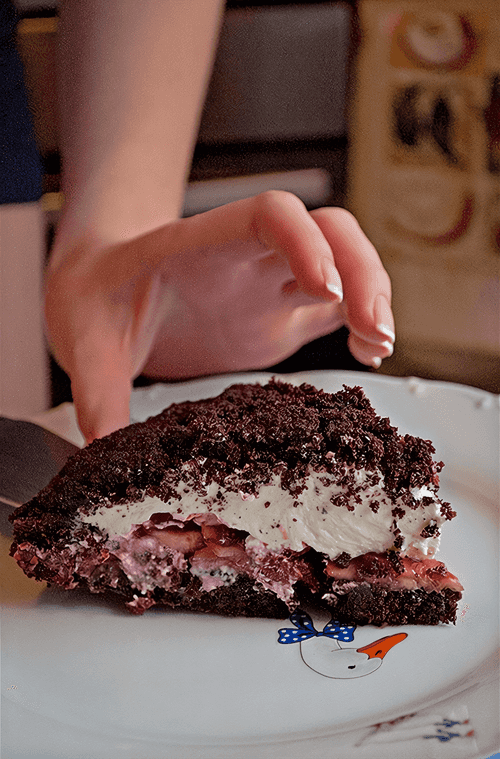 Для начинки режем бананы вдоль или кружочками. Выкладываем на дно торта. Затем идет черед вишен (если они замороженные, дайте им предварительно стечь. Я еще дополнительно их отжала). Сливки взбиваем с ванильным сахаром и желатином для сливок, либо взбиваем, добавляем обычный желатин и даем слегка схватиться. Затем выкладываем сливочное суфле сверху фруктов и прикрываем его крошками нашего шоколадного теста.