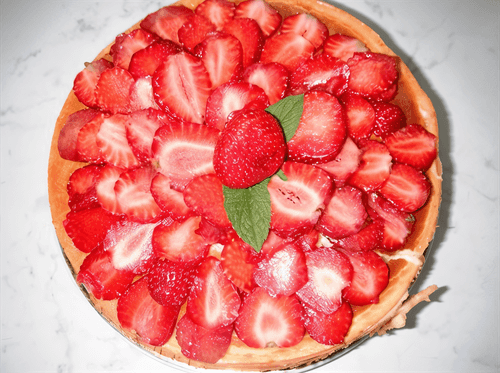 Клубнику вымыть и высушить, разрезать вдоль на несколько частей и украсить чизкейк — чем больше клубники, тем вкуснее.