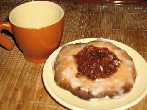 В каждом печенье сделать углубления столовой ложкой, положить в них по 1 чайной ложке конфитюра (конфитюр предварительно смешать с корицей и мускатным орехом).