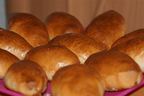 Пирожки уложить на противень, накрыть влажной салфеткой и оставить еще на 30 минут. Смазать взбитым яйцом.