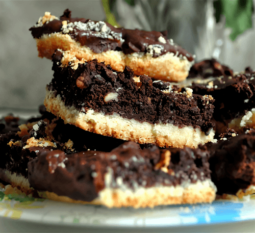 В другой емкости смешать оставшиеся 0,25 стакана муки, сгущенное молоко, какао, яйцо, кофе, ваниль и разрыхлитель. Мешать лучше ложкой. Потом добавить нарезанный орех пекан (можно заменить грецким, но у пекана более мягкий вкус) и аккуратно перемешать с тестом. Этим тестом залить приготовившийся коржик и поставить в духовку еще минут на 20.
