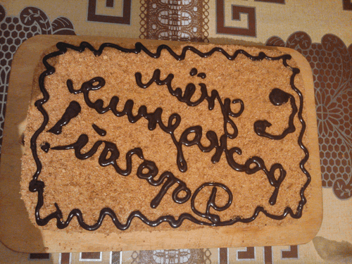 Украсить грецкими орехами и посыпать крошкой, оставшейся от обрезанных коржей.