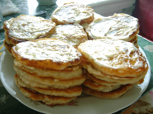 Далее все просто — жарить на растительном масле с двух сторон, выкладывать на тарелку стопочками, смазывая каждый слой майонезом, в который предварительно добавить измельченный чеснок.