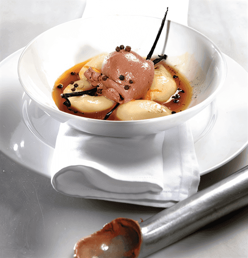 Положить в каждую чашку шарик шоколадного мороженого, уложить вокруг 2 груши вместе с карамелизованной смесью. Посыпать блюдо черным перцем и сбрызнуть груши 1 столовой ложкой оливкового масла.