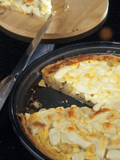 Киш с карамелизованным чесноком и травами — это изысканное блюдо французской кухни, которое сочетает в себе хрустящую масляную основу, нежную яично-сметанную заливку и ароматный карамелизованный чеснок с травами. Исторически киш появился в Лотарингии как простая крестьянская выпечка, но со временем стал символом гастрономической утонченности. В этом варианте чеснок, томленный в масле с розмарином и тимьяном, приобретает мягкость и сладость, прекрасно дополняя насыщенный вкус козьего сыра. Такой киш идеален для теплого семейного ужина или изысканного обеда с бокалом белого вина. Его глубина вкуса раскрывается постепенно, оставляя приятное послевкусие с легкими травяными нотками.