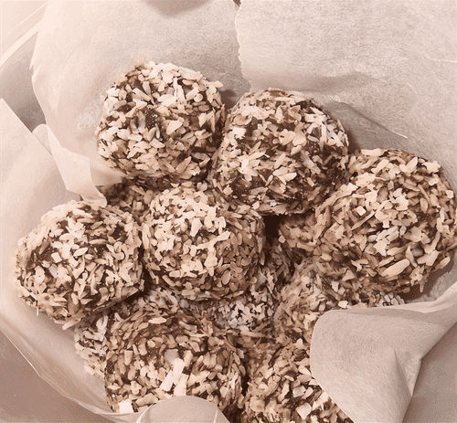 Брать по полторы чайной ложки смеси, руками формировать шарики, внутрь класть по ореху и обваливать в кокосовой стружке.