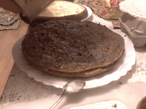 Уложить их все друг на друга, смазывая поочередно то сгущенкой с орехами, то клубничным кремом.