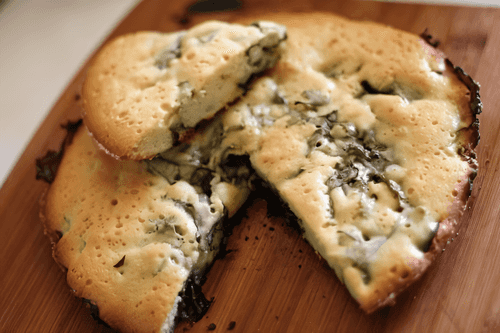 Смазать форму для запекания сливочным маслом и выложить щавель, замесить тестом.