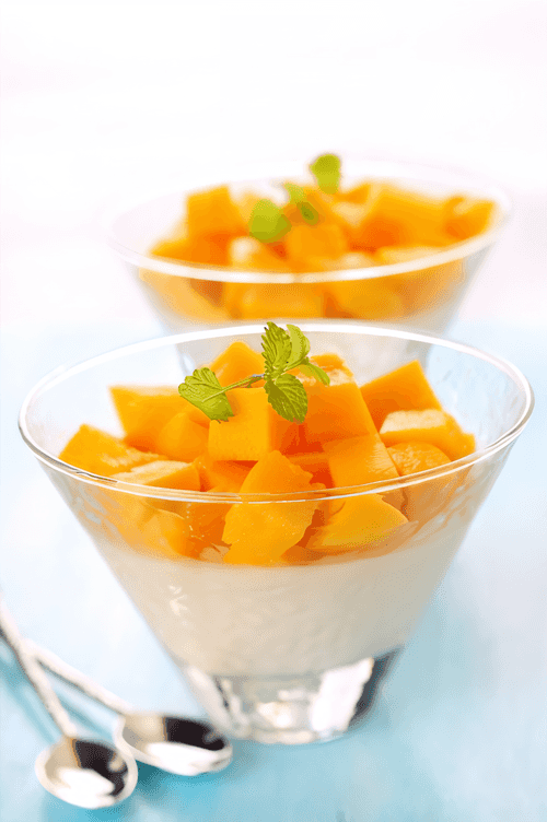 Тем временем, миксером взбейте рикотту и разложите по креманкам. Сверху выложите манго и сразу подавайте.