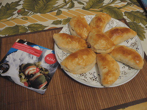 Раскатывать тесто толщиной в 0,5 см. Вырезать круги диаметром см по 12. На одну половину выложить немного яблочной начинки, смазать края желтком, взбитым со сливками, сложить пирожок пополам, прижимая края.