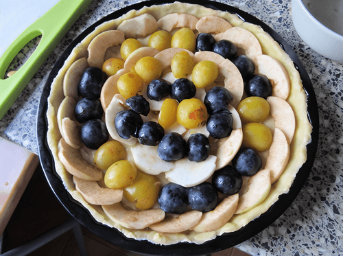 Тесто поместить в форму с бортиками, дно теста смазываем белком (чтобы сок не смягчал теста и оно пропеклось). Бортики и дно обложить фруктами в художественном беспорядке.