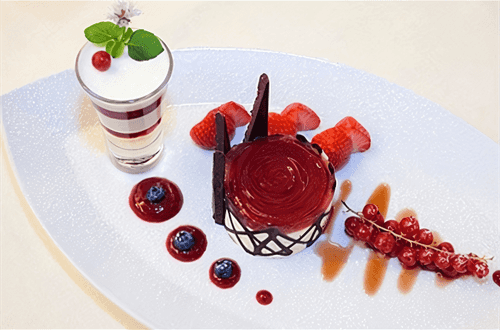 Баварезе с десертным вином — изысканный итальянский десерт, восходящий к французским баварским кремам. Его нежная текстура достигается благодаря гармоничному сочетанию желатина, яичных желтков и сливок, а добавление сладкого белого вина придаёт крему тонкую фруктовую нотку. Баварезе обладает утончённым вкусом: лёгкая сладость переплетается с шелковистой кремовой основой, а шоколадная клубника добавляет роскошное завершение. Этот десерт идеально подходит для торжественных случаев, когда хочется удивить гостей элегантностью и богатством вкусов. Подаётся охлаждённым, его можно украсить свежими ягодами или дополнительными элементами, подчеркивающими его изысканность. Баварезе не только радует глаз своим благородным видом, но и дарит настоящее гастрономическое удовольствие, оставляя на языке долгий, приятный послевкусие.