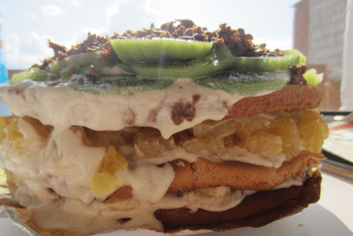 Фруктовый торт — это настоящий праздник вкуса и цвета, вдохновленный традициями греческой кухни. Его воздушные бисквитные коржи пропитаны нежным сметанным кремом, который придает десерту легкость и свежесть. В начинке сочетаются сладость бананов, цитрусовая свежесть апельсинов и яркий вкус киви, создавая гармонию текстур и оттенков. Каждый слой — это новая вкусовая палитра, завершающаяся насыщенной шоколадной стружкой, которая добавляет легкую горчинку. Такой торт станет украшением любого торжества, будь то семейный ужин или праздничное застолье. Греки ценят натуральные ингредиенты, и этот десерт — яркий пример соединения природы и кулинарного искусства. Он прекрасно подходит для летних вечеров, когда хочется легкого и освежающего лакомства.