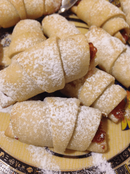 Смешать муку с водой, добавить масло и вымесить тесто, как на лапшу. Разделить на 3 части и каждую раскатать в виде круга. Разрезать круги на сектора, как пиццу, на широкий край каждого сектора положить джем (или густое варенье).