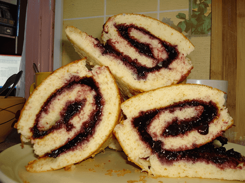 Горячий корж смажьте джемом и сверните в рулет, разрежьте на порции.