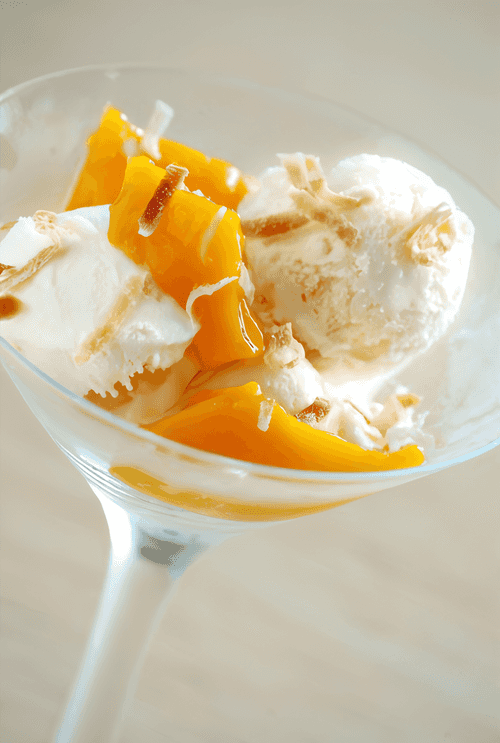 Очистите манго от кожи и косточки и порежьте небольшими сегментами. Выложите на противень и отправьте под гриль примерно на 10 минут до румяного цвета.