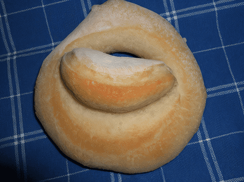 Другой способ — тесто раскатывают в овал и выемкой подрезают «губку».Так сформован калач на фото на синем фоне (насколько я поняла, так формуют все-таки не Московские, а Ленинградские калачи).