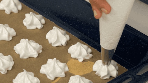 Поместить белки в пакет с разными насадками (что-то вроде кондитерского шприца, только попроще). Можно сделать маленькие безе или большие.