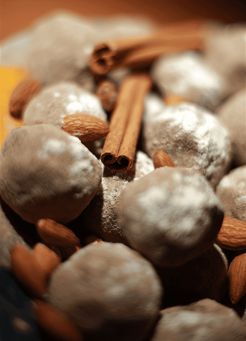 Смачивая руки водой, отщипываем массу, в центр прячем миндальный орешек и обваливаем в оставленной обсыпке. Выкладываем на тарелку или доску и прячем в холодильник на 30 минут. Сверху посыпаем сахарной пудрой.