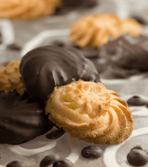 Курабье в шоколадной глазури — это изысканное печенье с хрупкой, нежной текстурой, дополненной насыщенной сладостью шоколадной глазури. Хотя само курабье имеет восточные корни, этот вариант с глазурью несет мексиканский дух, ведь шоколад издревле был ценным ингредиентом в культуре майя и ацтеков. Печенье готовится на основе сливочного масла, придающего ему мягкость, а взбитые белки делают его воздушным. Аромат ванили и сахарная пудра гармонично сочетаются с шоколадной глазурью, создавая богатый вкус. Важно окунать курабье в растопленный шоколад, чтобы он покрыл поверхность ровным слоем. Это печенье идеально сочетается с горячим молоком и станет прекрасным дополнением к уютному вечеру или дружескому чаепитию.